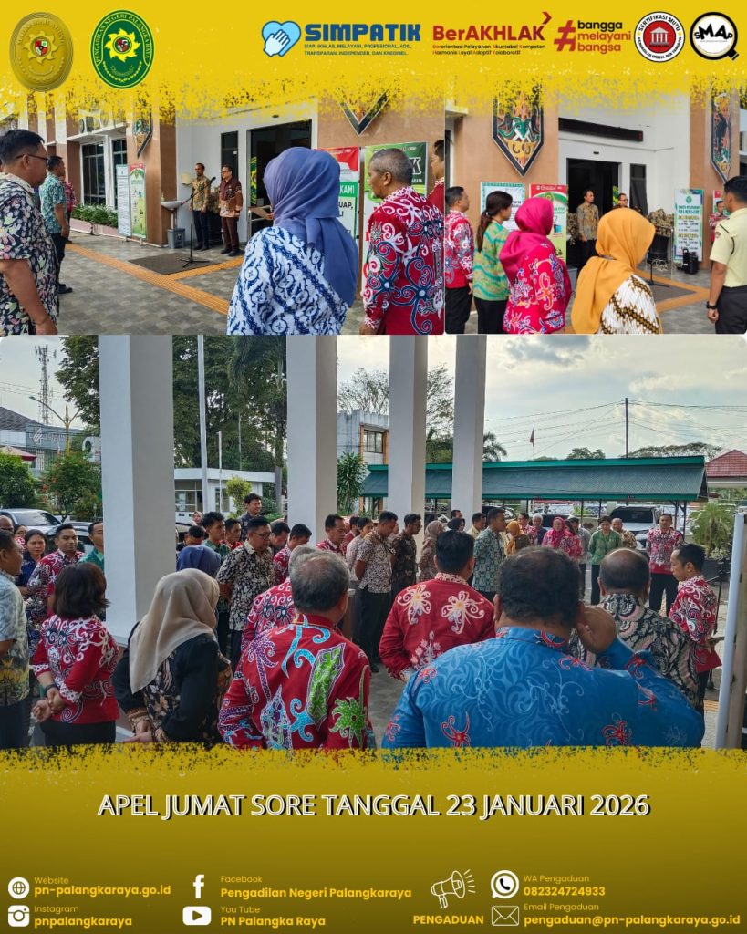 Palangka Raya – Jumat, 23 Januari 2026 pukul 15.45 WIB bertempat di Halaman Kantor Pengadilan Negeri Palangkaraya dilaksanakan kegiatan Apel Sore yang dipimpin oleh Wakil Ketua Pengadilan Negeri Palangkaraya Bapak R. HEDDY BELLYANDI, S.H., M.H., selaku Pembina Apel. Selanjutnya yang bertindak sebagai Komandan Apel Bapak TIMOTIUS AGNI ANGGA KUSUMA (PPPK), dan MC Bapak FERRY (PPPK). Kegiatan Apel Sore diikuti oleh Para Hakim, Panitera, Sekretaris, Pejabat Struktural dan Fungsional, Pegawai, PPPK pada Pengadilan Negeri Palangkaraya.
