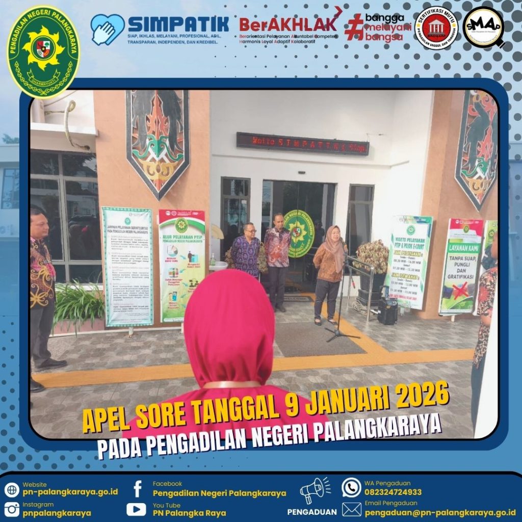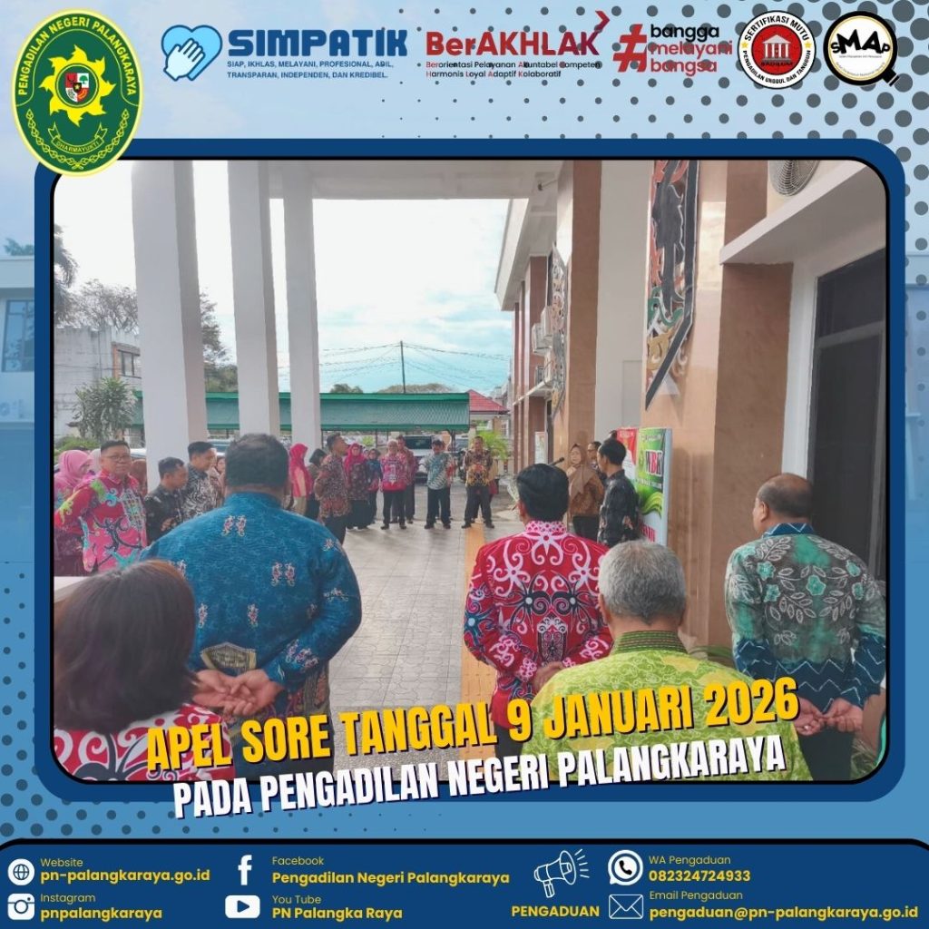 Palangka Raya – Jumat, 09 Januari 2026 pukul 15.45 WIB bertempat di Halaman Kantor Pengadilan Negeri Palangkaraya dilaksanakan kegiatan Apel Sore yang dipimpin oleh Hakim Adhoc Tipikor Pengadilan Negeri Palangkaraya Ibu FRANSISCA KIKI DAMAYANTI, S.H., M.H., selaku Pembina Apel. Selanjutnya yang bertindak sebagai Komandan Apel Bapak TIMOTIUS AGNI ANGGA KUSUMA (PPPK), dan MC Bapak JIMI ADE CANDRA (PPPK). Kegiatan Apel Sore diikuti oleh Para Hakim, Panitera, Sekretaris, Pejabat Struktural dan Fungsional, Pegawai, PPPK pada Pengadilan Negeri Palangkaraya.