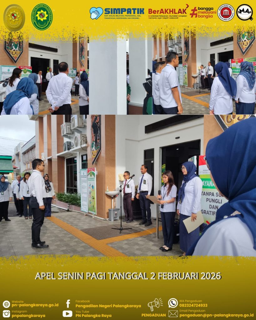 Palangka Raya – Senin, 2 Februari 2026 pukul 08.00 WIB, Pengadilan Negeri Palangkaraya telah melaksanakan Apel Senin Pagi bertempat di halaman kantor Pengadilan Negeri Palangkaraya. Kegiatan ini dipimpin oleh Ketua Pengadilan Negeri Palangkaraya Bapak Ricky Fardinand, S.H., M.H. selaku pembina apel. Selanjutnya yang bertindak sebagai komandan apel yaitu Bapak Eska Juli Firnando Simanjuntak, S.H., Pembawa Acara/MC Ibu Eventy Velly Palawa, S.H., dan pembaca 7 Nilai Utama Mahkamah Agung RI Ibu Ika Murtianingsih, S.H., Kegiatan Apel Pagi diikuti oleh Para Hakim, Pejabat Struktural dan Fungsional, Pegawai, PPPK, Tenaga Outsourcing dan Mahasiswa Magang pada Pengadilan Negeri Palangkaraya.