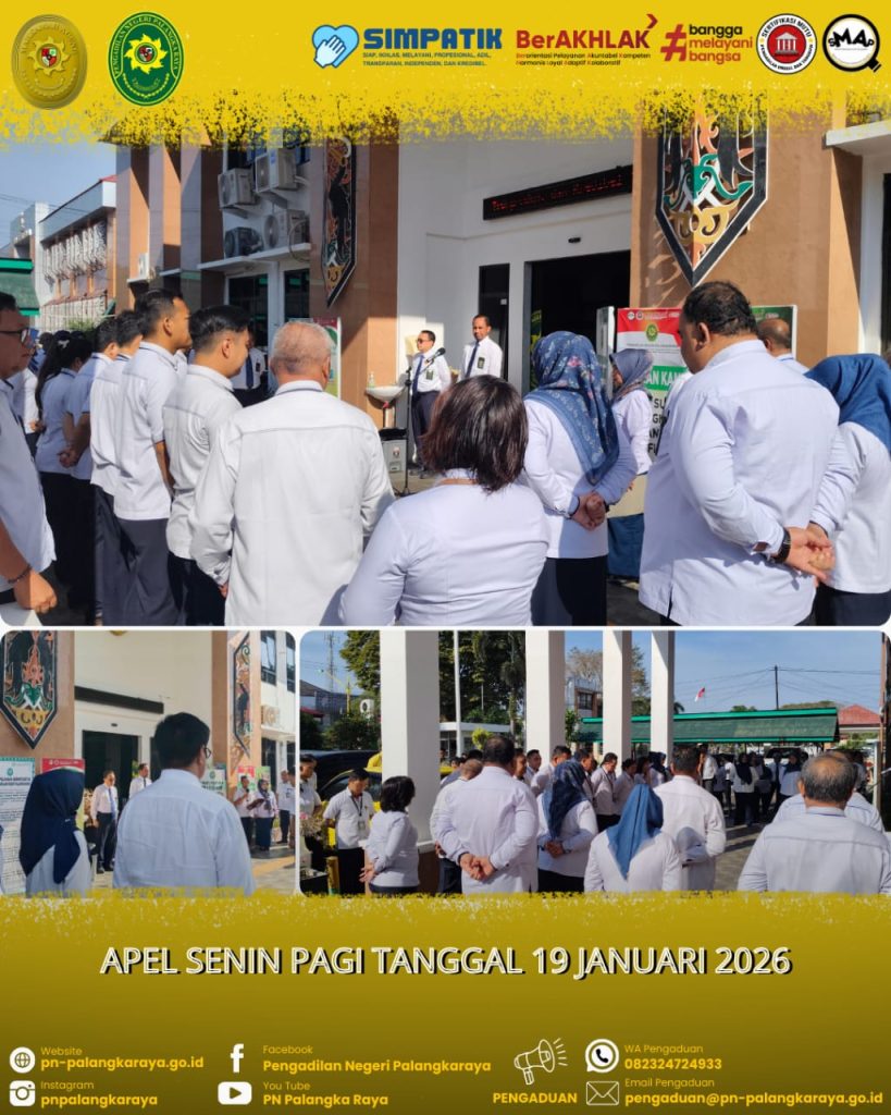 Palangka Raya – Senin, 19 Januari 2026 pukul 08.00 WIB, Pengadilan Negeri Palangkaraya telah melaksanakan Apel Senin Pagi bertempat di halaman kantor Pengadilan Negeri Palangkaraya. Kegiatan ini dipimpin oleh Ketua Pengadilan Negeri Palangkaraya Bapak Ricky Fardinand, S.H., M.H. selaku pembina apel. Selanjutnya yang bertindak sebagai komandan apel yaitu Bapak Gilang Rahadian Saputra, S.H., Pembawa Acara/MC Bapak Ferry, S.E., dan pembaca 7 Nilai Utama Mahkamah Agung RI Ibu Jumiati, S.H. Kegiatan Apel Pagi diikuti oleh Para Hakim, Pejabat Struktural dan Fungsional, Pegawai, PPPK, Tenaga Outsourcing dan Mahasiswa Magang pada Pengadilan Negeri Palangkaraya.