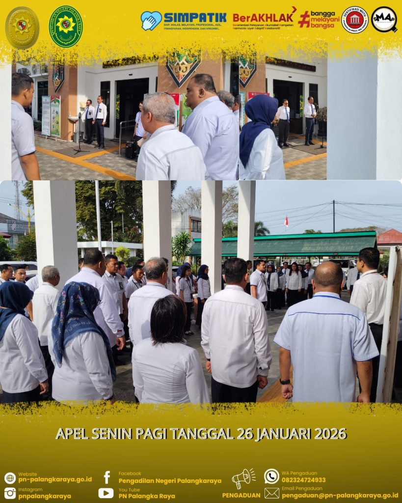 Palangka Raya – Senin, 26 Januari 2026 pukul 08.00 WIB, Pengadilan Negeri Palangkaraya telah melaksanakan Apel Senin Pagi bertempat di halaman kantor Pengadilan Negeri Palangkaraya. Kegiatan ini dipimpin oleh Ketua Pengadilan Negeri Palangkaraya Bapak Ricky Fardinand, S.H., M.H. selaku pembina apel. Selanjutnya yang bertindak sebagai komandan apel yaitu Bapak Federius Halawa, S.H., Pembawa Acara/MC Bapak Anita Selvia, S.E., dan pembaca 7 Nilai Utama Mahkamah Agung RI Bapak Eska Juli Firnando Simanjuntak, S.H. Kegiatan Apel Pagi diikuti oleh Para Hakim, Pejabat Struktural dan Fungsional, Pegawai, PPPK, Tenaga Outsourcing dan Mahasiswa Magang pada Pengadilan Negeri Palangkaraya.