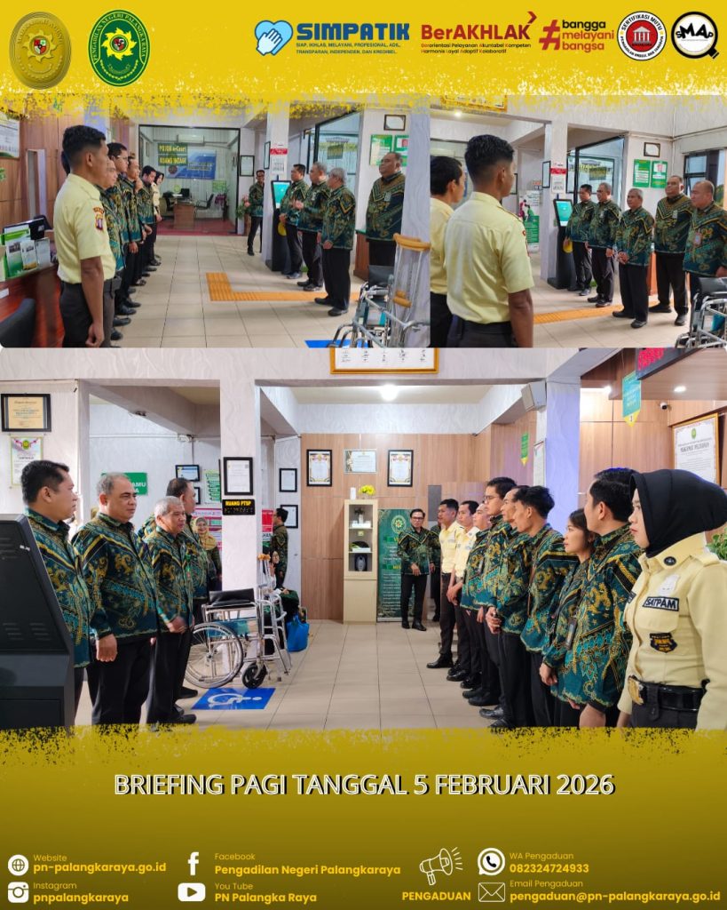 Palangka Raya – Kamis, 05 Februari 2026 pukul 08.10 WIB bertempat di Lobby PTSP Pengadilan Negeri Palangkaraya diadakan Briefing pagi kepada petugas PTSP Pengadilan Negeri Palangkaraya. Kegiatan ini dipimpin Panitera, Sekretaris, dan para Panmud pada Pengadilan Negeri Palangkaraya. Kegiatan dihadiri seluruh Petugas PTSP Pengadilan Negeri Palangkaraya. Dalam kesempatan tersebut Pengawas PTSP menyampaikan agar jangan ada kekosongan di PTSP karena merupakan penilaian oleh Badilum, selain itu pula agar petugas PTSP senantiasa menerapkan budaya kerja 5S (Senyum, Salam, Sapa, Sopan, Santun) dan tetap menjalankan tugas dan fungsi masing-masing bagian dengan ikhlas dan setulus hati.