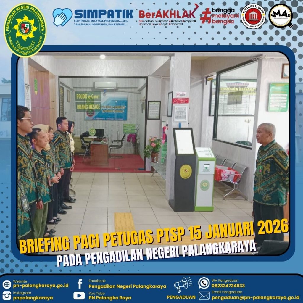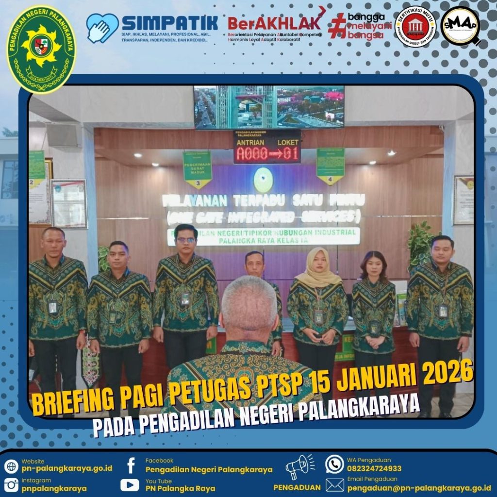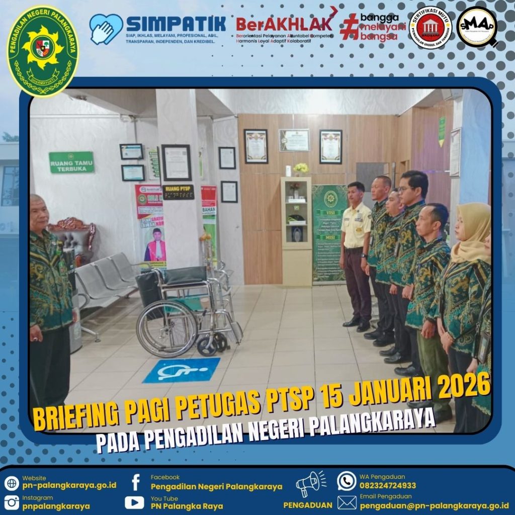 Palangka Raya – Kamis, 15 Januari 2026 pukul 08.10 WIB bertempat di Lobby PTSP Pengadilan Negeri Palangkaraya diadakan Briefing pagi kepada petugas PTSP Pengadilan Negeri Palangkaraya. Kegiatan ini dipimpin Panitera Muda PHI Pengadilan Negeri Palangkaraya, Bapak KUNCORO TATWO PRATISTO, S.H. Kegiatan dihadiri seluruh Petugas PTSP Pengadilan Negeri Palangkaraya. Dalam kesempatan tersebut Hakim Pengawas Bidang PTSP menyampaikan agar jangan ada kekosongan di PTSP karena merupakan penilaian oleh Badilum, selain itu pula agar petugas PTSP senantiasa menerapkan budaya kerja 5S (Senyum, Salam, Sapa, Sopan, Santun) dan tetap menjalankan tugas dan fungsi masing-masing bagian dengan ikhlas dan setulus hati.