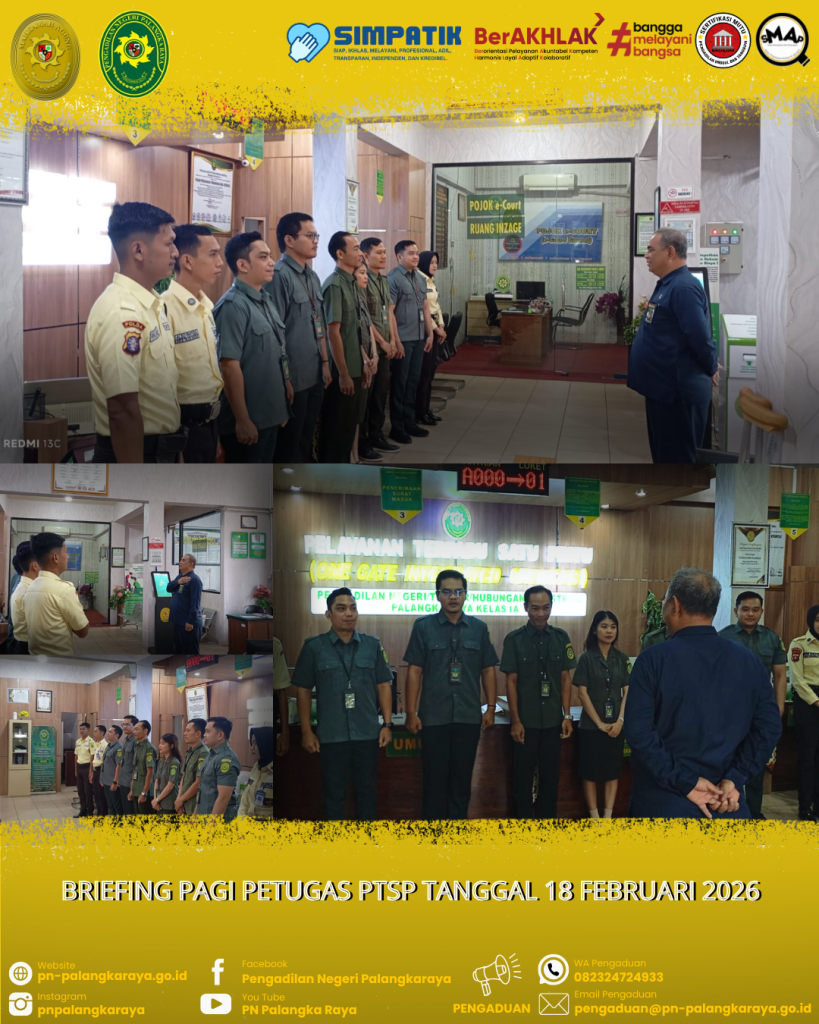 Palangka Raya – Rabu, 18 Februari 2026 pukul 08.10 WIB bertempat di Lobby PTSP Pengadilan Negeri Palangkaraya diadakan Briefing pagi kepada petugas PTSP Pengadilan Negeri Palangkaraya. Kegiatan ini dipimpin oleh Panitera Muda Khusus Tipikor Pengadilan Negeri Palangkaraya Bapak EFRAIM, S.H., M.H. Kegiatan dihadiri seluruh Petugas PTSP Pengadilan Negeri Palangkaraya. Dalam kesempatan tersebut Pengawas PTSP menyampaikan agar jangan ada kekosongan di PTSP karena merupakan penilaian oleh Badilum, selain itu pula agar petugas PTSP senantiasa menerapkan budaya kerja 5S (Senyum, Salam, Sapa, Sopan, Santun) dan tetap menjalankan tugas dan fungsi masing-masing bagian dengan ikhlas dan setulus hati.