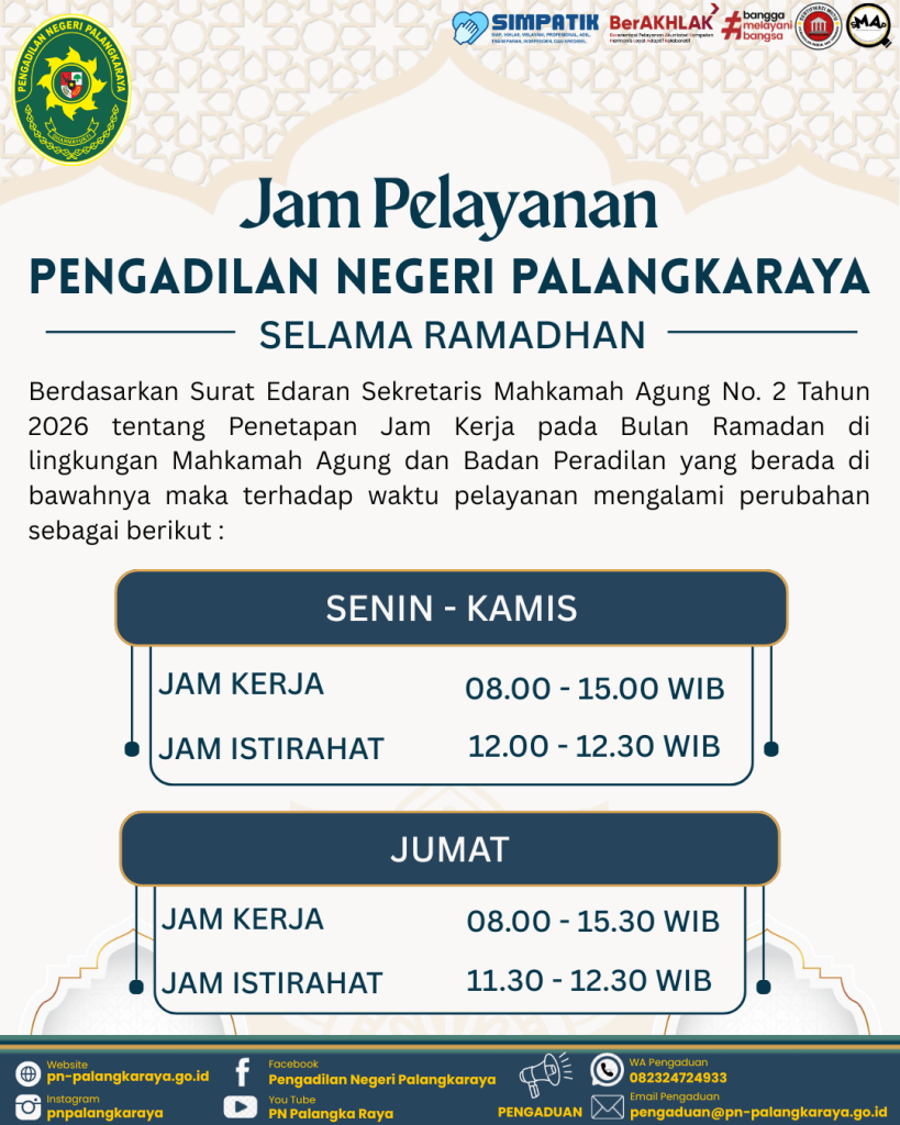 Berikut jam pelayanan selama bulan Ramadhan pada Pengadilan Negeri Palangkaraya berdasarkan Surat Edaran Sekretaris Mahkamah Agung No.2 Tahun 2026: SCAN QR-CODE BROSUR LAYANAN Kepaniteraan Tipikor Kepaniteraan PHI Subbag Umum Lihat Brosur Lihat Brosur Lihat Brosur E-Court Kepaniteraan Pidana Kepaniteraan Hukum 1 Lihat Brosur Lihat Brosur Lihat Brosur Kepaniteraan Hukum 2 Kepaniteraan Perdata Gugatan Sederhana Lihat Brosur Lihat Brosur Lihat Brosur E-Court Kepaniteraan Pidana Kepaniteraan Hukum 1 Lihat Brosur Lihat Brosur Lihat Brosur Pijar Lihat Brosur DOKUMEN ZONA INTEGRITAS KOMPONEN PENGUNGKIT PEMENUHAN KOMPONEN PENGUNGKIT REFORM KOMPONEN HASIL