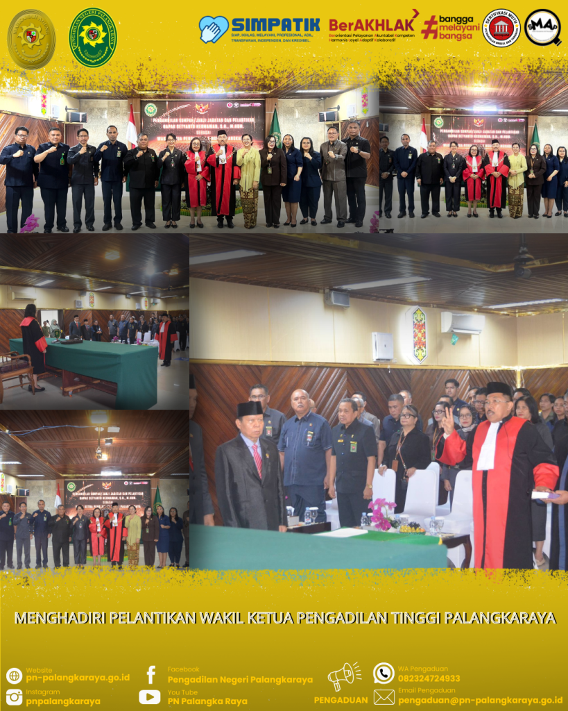 Palangkaraya – Rabu, 18 Februari 2026, Ketua Pengadilan Negeri Palangkaraya Bapak Ricky Fardinand, S.H., M.H., menghadiri acara pelantikan Wakil Ketua Pengadilan Tinggi Palangkaraya yang berlangsung khidmat dan penuh makna. Kegiatan tersebut dilaksanakan di Aula Pengadilan Tinggi Palangkaraya dengan dihadiri oleh jajaran pimpinan pengadilan, para hakim tinggi, pejabat struktural dan fungsional, serta tamu undangan lainnya.