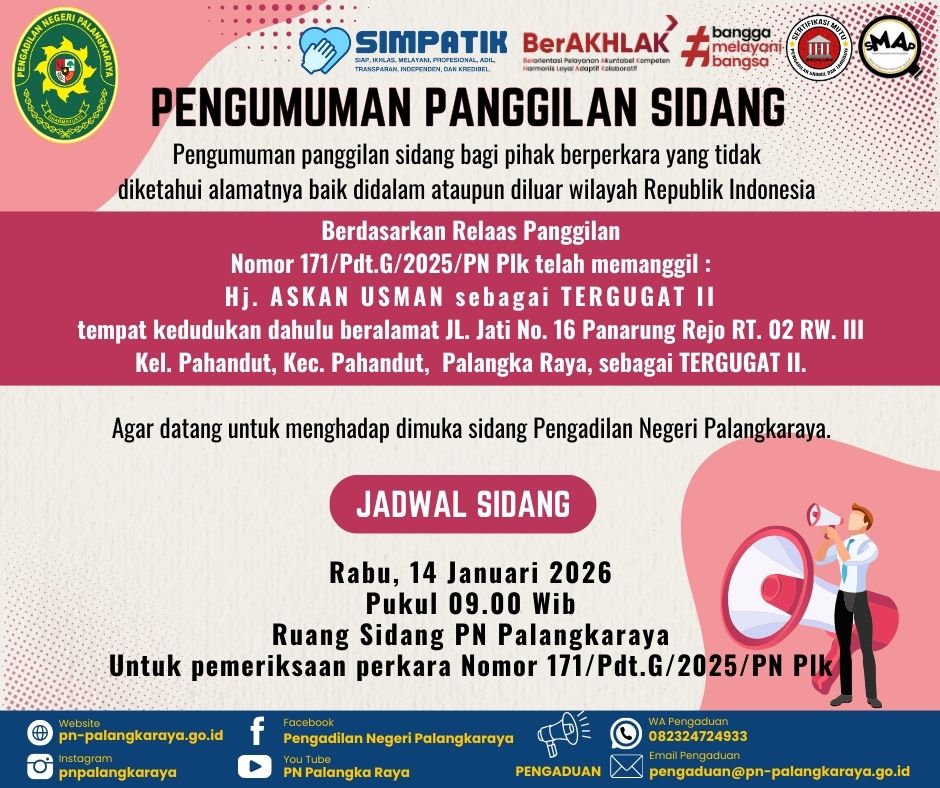 Pengumuman panggilan sidang bagi pihak berperkara yang tidak diketahui alamatnya baik didalam atau diluar wilayah Republik Indonesia. Berdasarkan Relaas Panggilan Nomor 171/Pdt.G/2025/PN Plk telah memanggil :