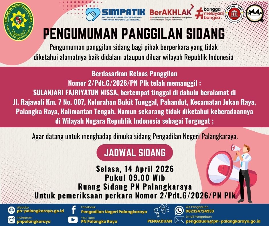 Berdasarkan Relaas Panggilan Nomor 2/Pdt.G/2026/PN Plk telah memanggil :