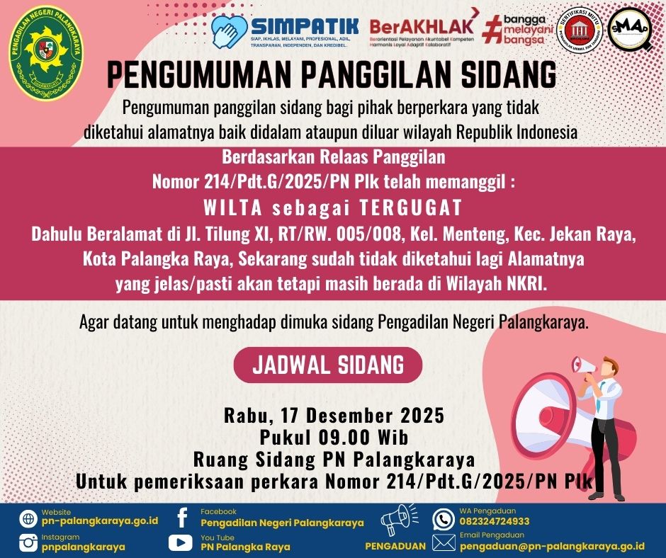 Berdasarkan Relaas Panggilan Nomor 214/Pdt.G/2025/PN Plk telah memanggil :
