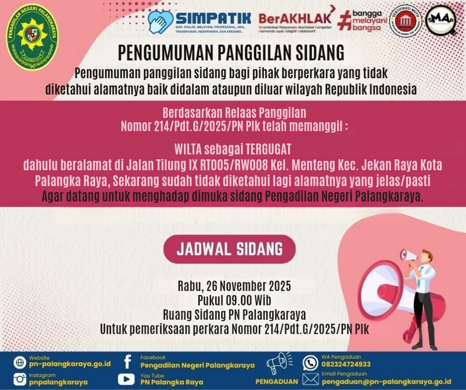 Berdasarkan Relaas Panggilan Nomor 214/Pdt.G/2025/PN Plk telah memanggil :