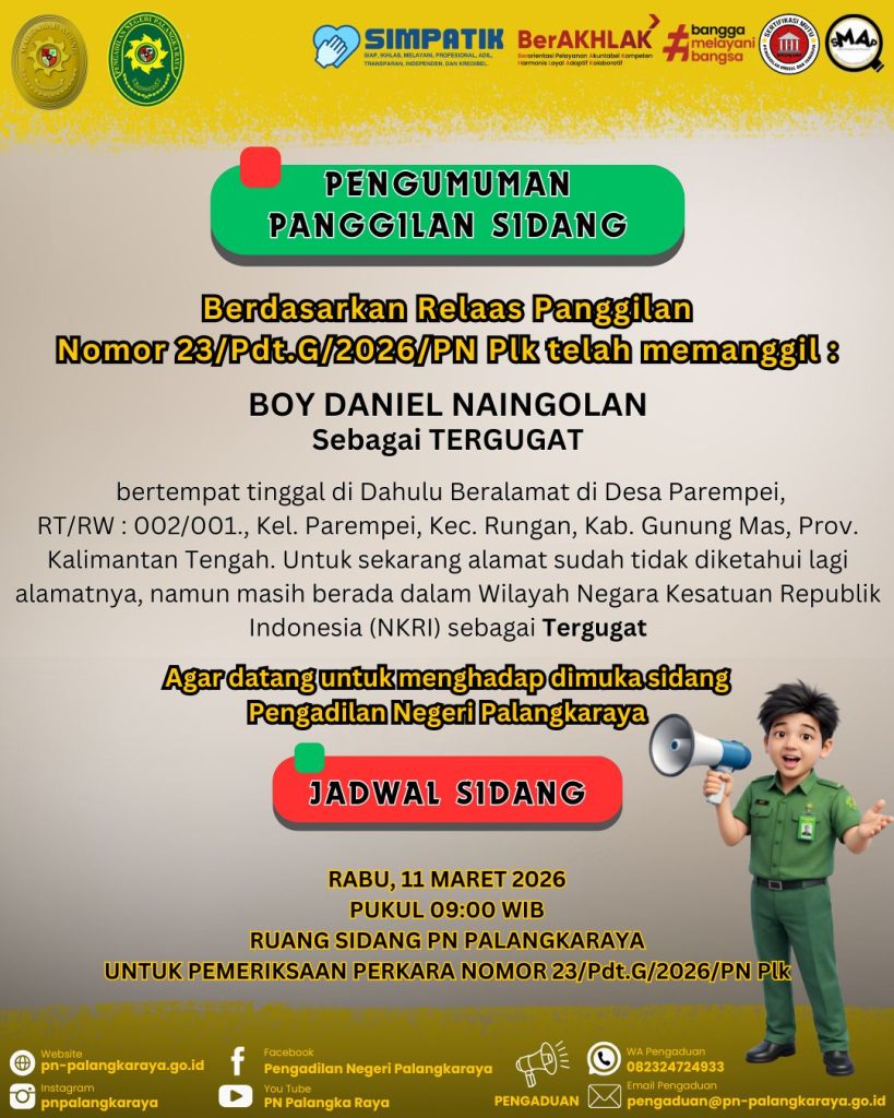 untuk menghadap sidang Pengadilan Negeri Palangkaraya yang diselenggarakan di :