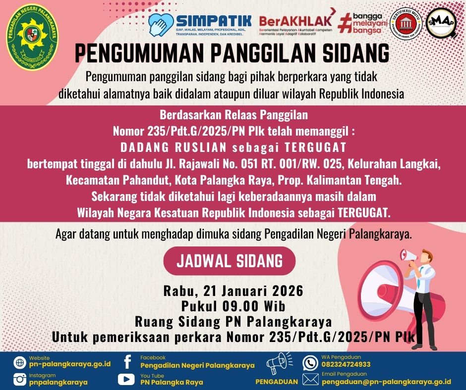 PANGGILAN SIDANG PERKARA NOMOR 235/Pdt.G/2025/PN PLK