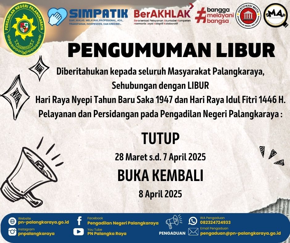 PENGUMUMAN LIBUR-Di beritahukan kepada seluruh masyarakat kota Palangka Raya sehubungan dengan libur Hari Raya Nyepi Tahun Baru Saka 1947 dan Hari Raya Idul Fitri 1446 H, Pelayanan dan Persidangan pada Pengadilan Negeri Palangkaraya TUTUP pada tanggal 28 Maret s/d 7 April 2025, dan buka kembali pada tanggal 8 April 2025.