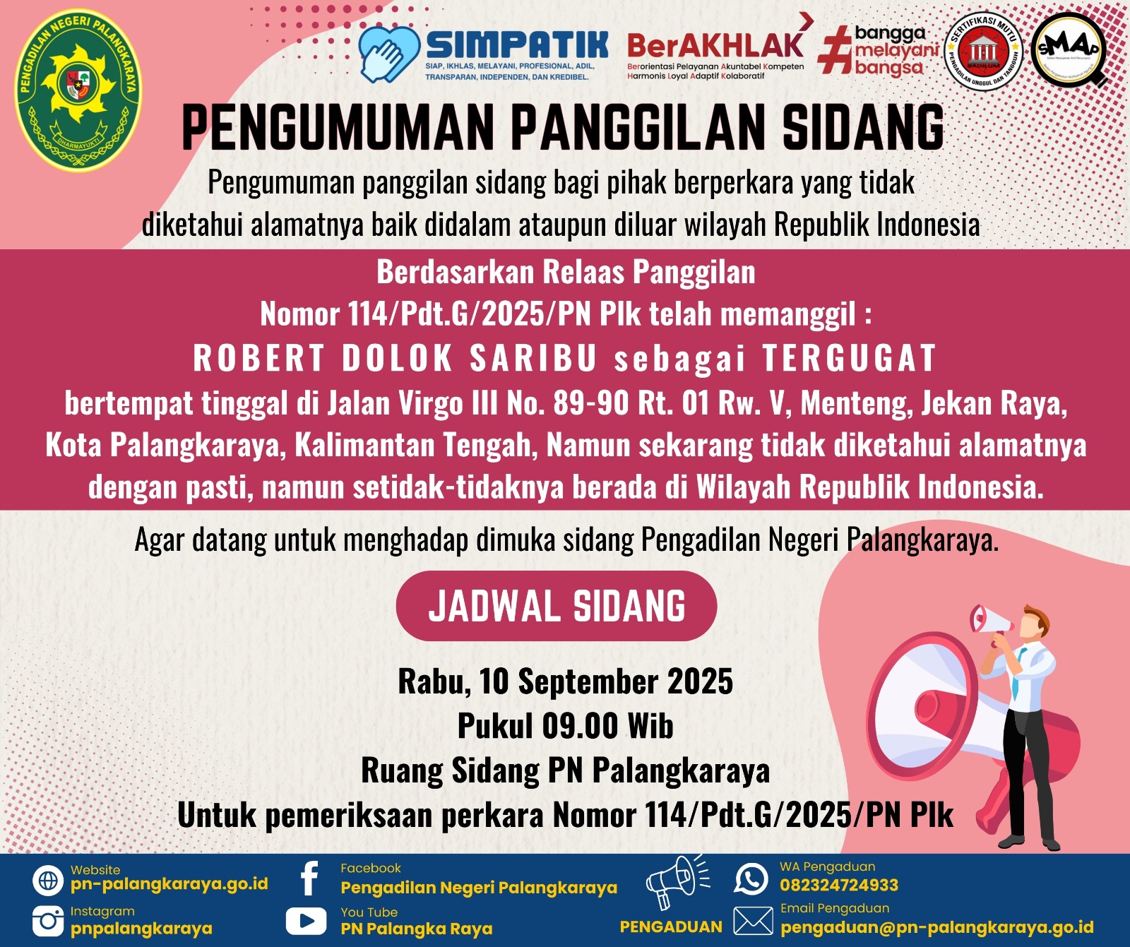 PENGUMUMAN PANGGILAN SIDANG NOMOR 114/Pdt.G/2025/PN Plk