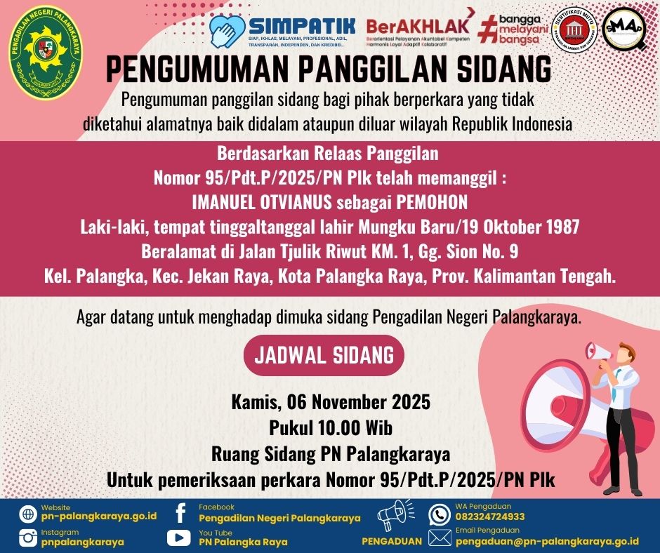 Berdasarkan Relaas Panggilan Nomor 95/Pdt.P/2025/PN Plk telah memanggil :