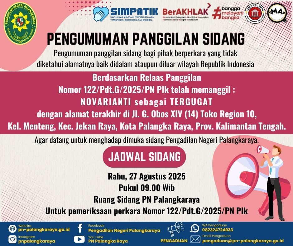 Berdasarkan Relaas Panggilan Nomor 122/Pdt.G/2025/PN Plk telah memanggil :
