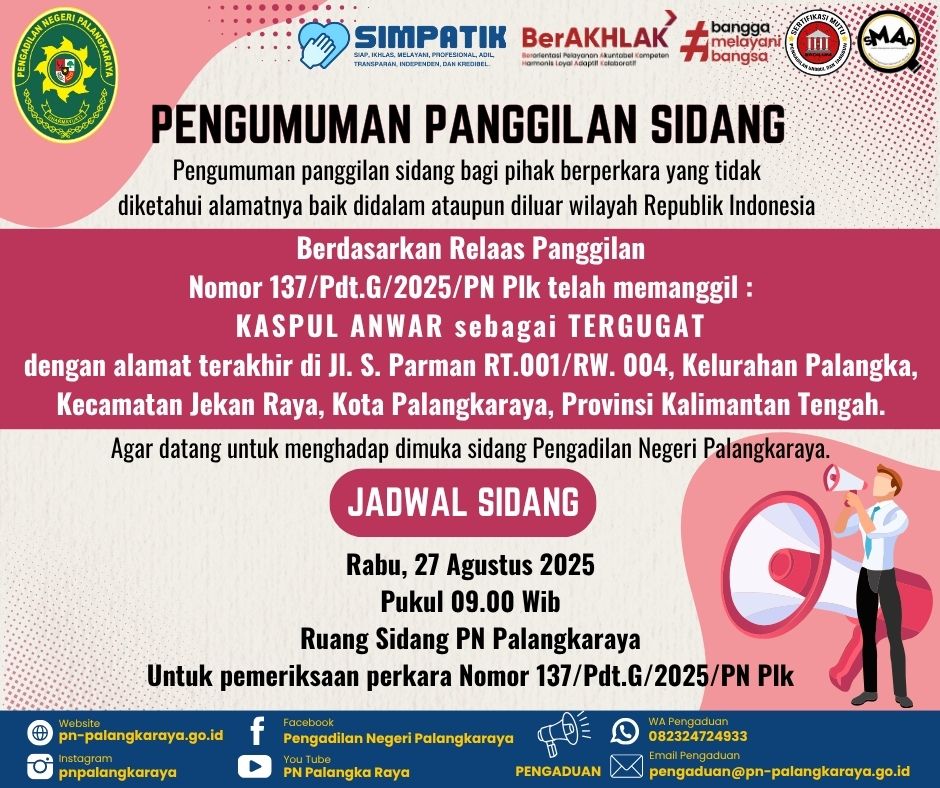 Berdasarkan Relaas Panggilan Nomor 137/Pdt.G/2025/PN Plk telah memanggil :