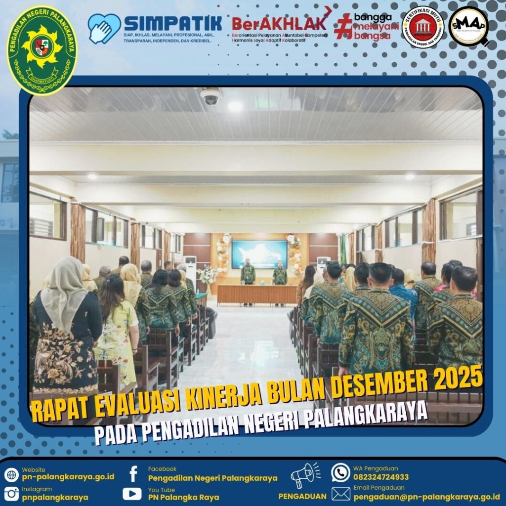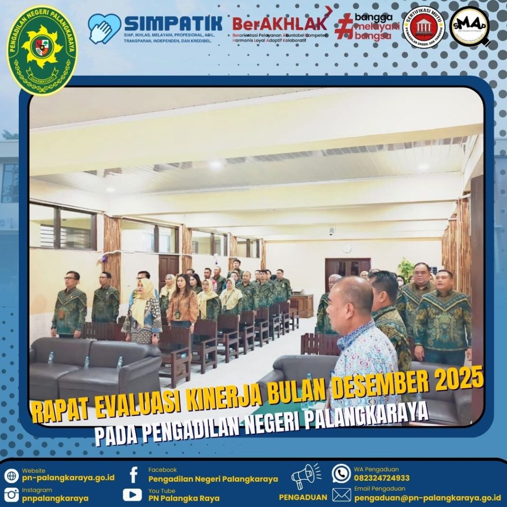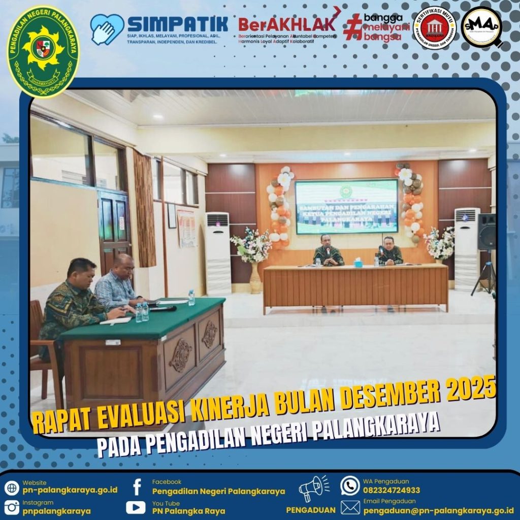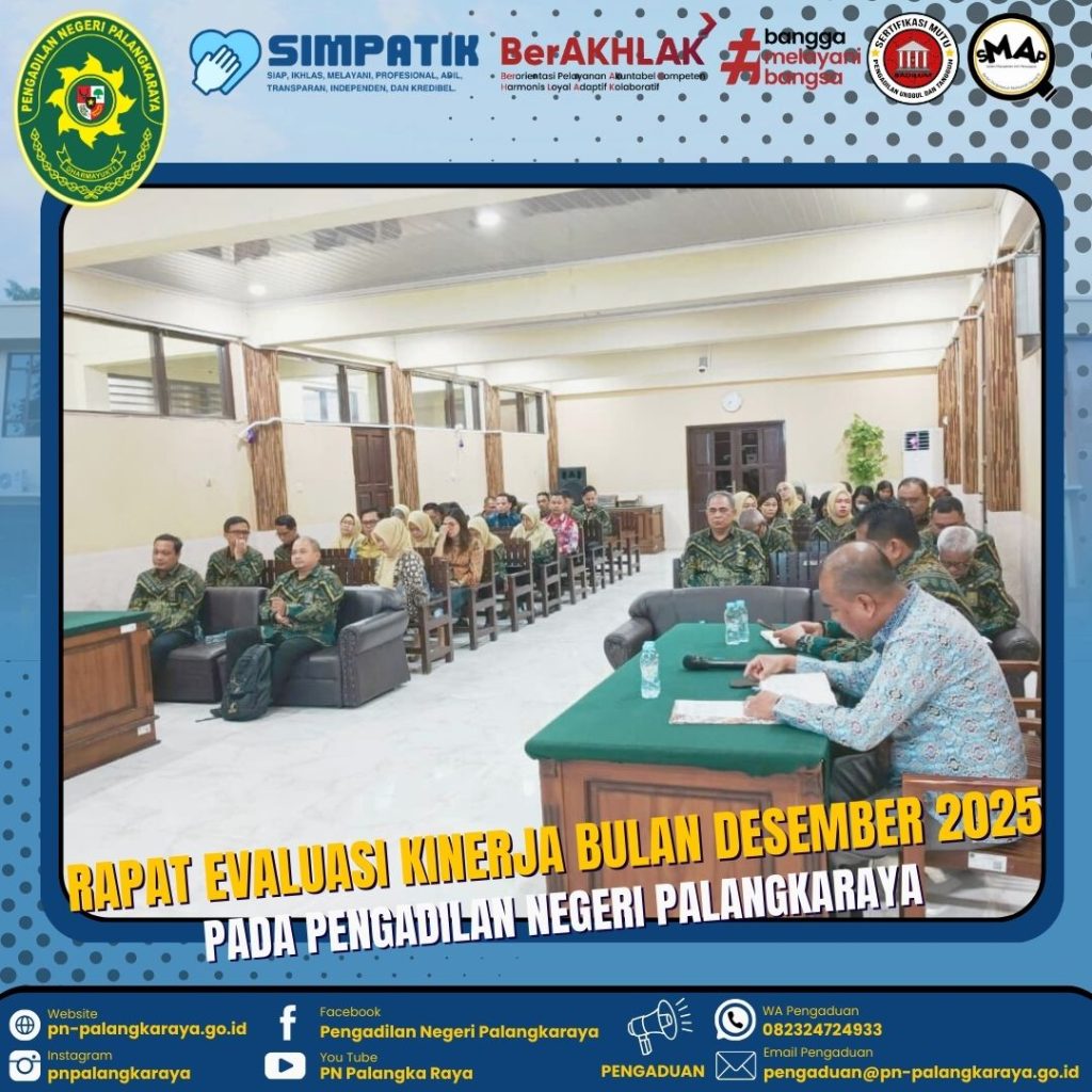 Palangka Raya – Kamis, 15 Januari 2026 Pukul 08.15 WIB bertempat di Ruang Aula Pertemuan Pengadilan Negeri Palangkaraya dilaksanakan kegiatan Rapat Evaluasi Kinerja bulan Desember 2025. Rapat di pimpin oleh Ketua Pengadilan Negeri Palangkaraya Bapak Ricky Fardinand, S.H., M.H., didampingi Wakil Ketua Pengadilan Negeri Palangkaraya Bapak R. Heddy Bellyandi, S.H., M.H., dan diikuti oleh seluruh Hakim, Pejabat Struktural/Fungsional, Pegawai, PPPK, dan PPNPN. Dalam kesempatan tersebut Ketua Pengadilan Negeri Palangkaraya Bapak Ricky Fardinand, S.H., M.H. beliau mengingatkan bahwa terkait SMAP agar tetap di lakukan evaluasi secara berkala, selain itu, Administrasi perkara dan persidangan harus tetap di kerjakan sesui waktu yg telah di tetapkan.