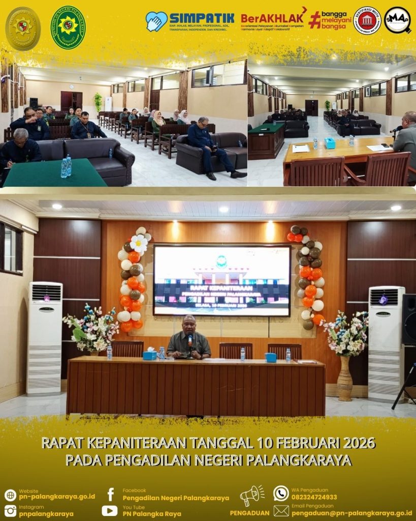 Palangka Raya – Selasa, 10 Februari 2026 bertempat di Ruang Command Center Pengadilan Negeri Palangkaraya dilaksanakan Rapat Kepaniteraan Pengadilan Negeri Palangkaraya yang dipimpin oleh Panitera Pengadilan Negeri Palangkaraya Bapak BUDIYANOOR, S.H. Rapat di hadiri oleh seluruh Panitera Muda, Panitera Pengganti, Jurusita serta seluruh staf Kepaniteraan pada Pengadilan Negeri Palangkaraya. Dalam kesempatan tersebut beliau Menyampaikan Perma 8 dan 9, dan Penginputan akurasi data mengenai pengunggahan BA, court kalender serta penginputan salinan putusan tepat waktu.