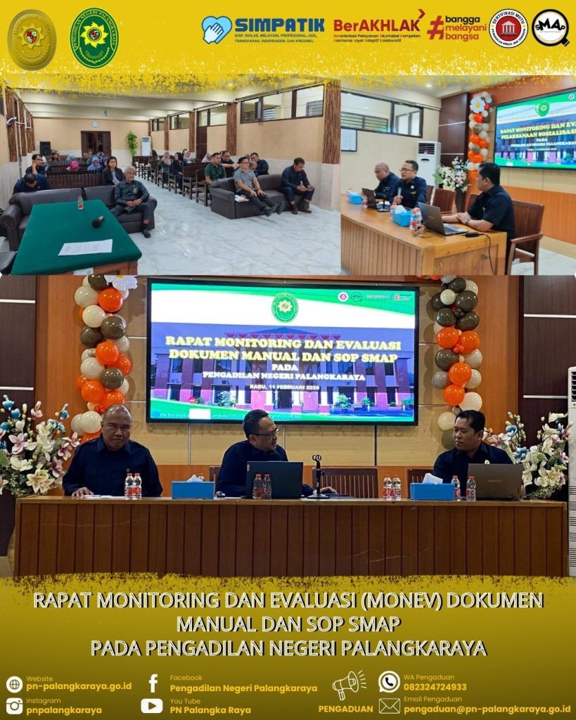 Palangka Raya – Rabu, 11 Februari 2026, Bertempat diruang Media Center Pengadilan Negeri Palangkaraya Klas IA melaksanakan Rapat Monitoring dan Evaluasi (Monev) Dokumen Manual dan SOP SMAP.