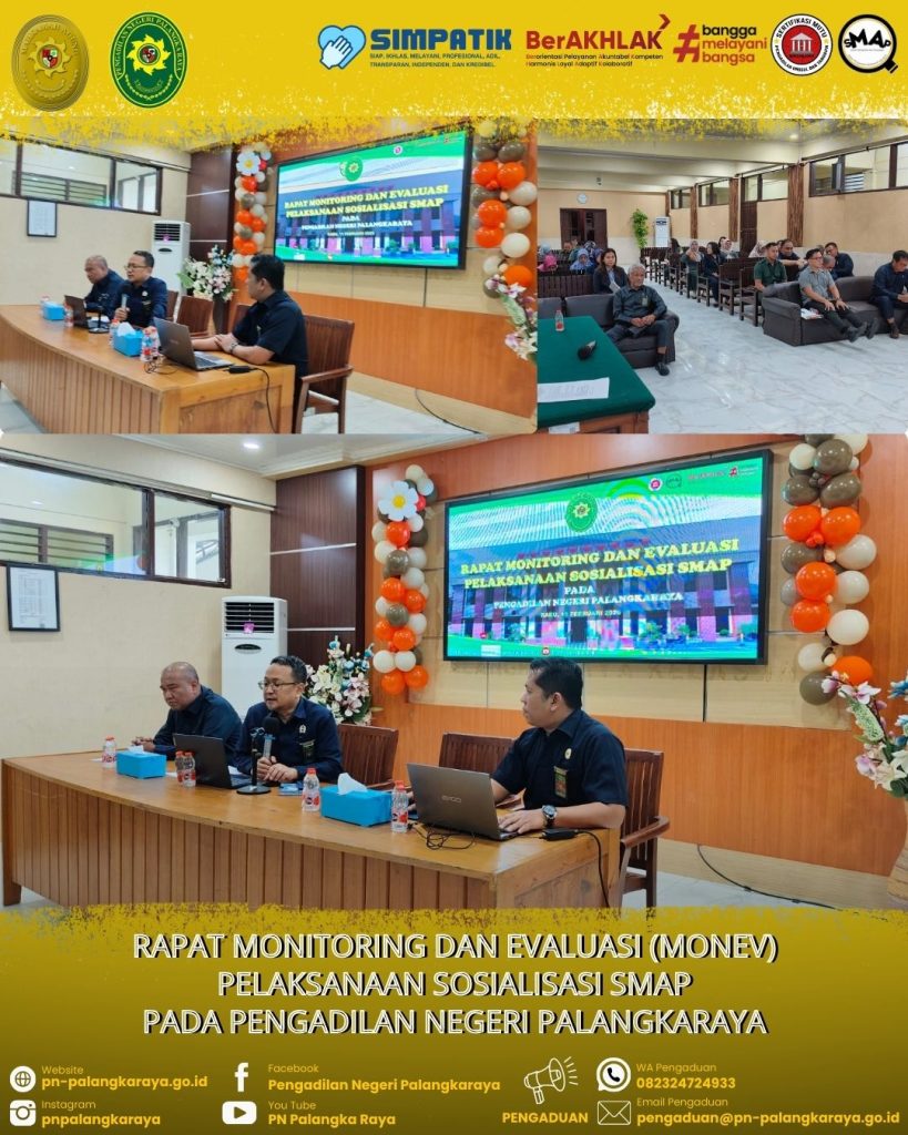 Palangka Raya – Rabu, 11 Februari 2026, Bertempat diruang Media Center Pengadilan Negeri Palangkaraya Klas IA melaksanakan Rapat Monitoring dan Evaluasi (Monev) Pelaksanaan Sosialisasi SMAP.